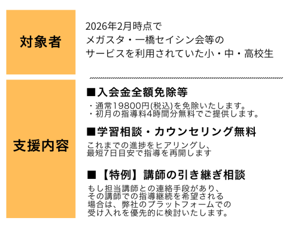 メガスタ・一橋セイシン会をご利用されていた皆様の経済的・心理的負担を軽減するため、以下の支援を行います。