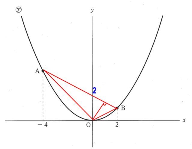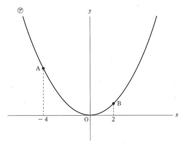次の図のように、関数y=1/4x² ・・・アのグラフ上に2点A、Bがあり、点Aの x座標が-4, 点Bのx座標が2である。このとき、あとの各問いに答えなさい。ただし、原点をOとし、座標軸の1目もりを1cmとする。