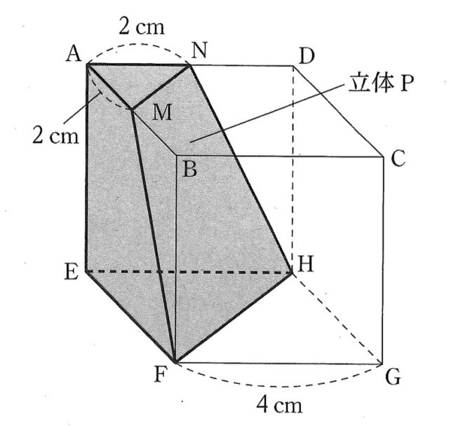 右の図のように、点A, B, C, D, E, F, G, Hを頂点とする、1辺の長さが4cmの立方体がある。線分AB, AD上にAM=AN=2cmとなる点M, Nをとり、6点A, M, N, E, F, Hを結んで立体Pをつくる。このとき、あとの各問いに答えなさい。