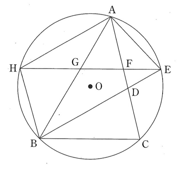次の図のように、∠ABC<90°の△ABCと、3点A, B, Cを通る円Oがある。∠ABCの二等分線と線分AC, 円Oとの交点をそれぞれD, Eとし、線分AEをひく。点Eを通り線分CBに平行な直線と線分AC, 線分AB, 円Oとの交点をそれぞれF, G, Hとし、線分AHと線分BHをひく。このとき、あとの各問いに答えなさい。ただし、点Eは点Bと異なる点、点Hは点Eと異なる点とする。