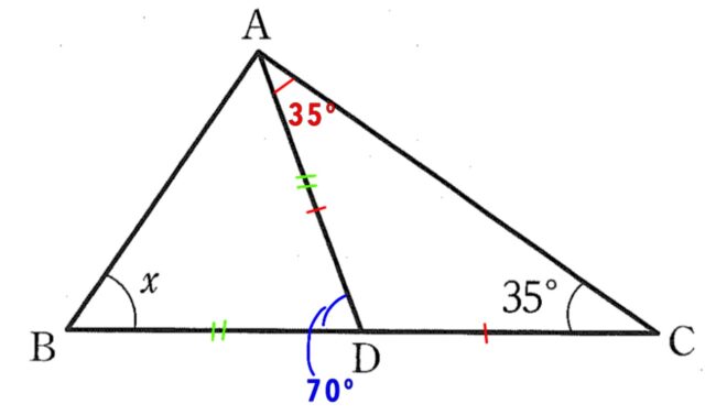 △ABDに注目すると、AD = BDなので、△ABDも二等辺三角形です。よって、底角である∠xと ∠BADは同じ大きさです。三角形の内角の和は180°なので、∠x + ∠x + 70° = 180°
