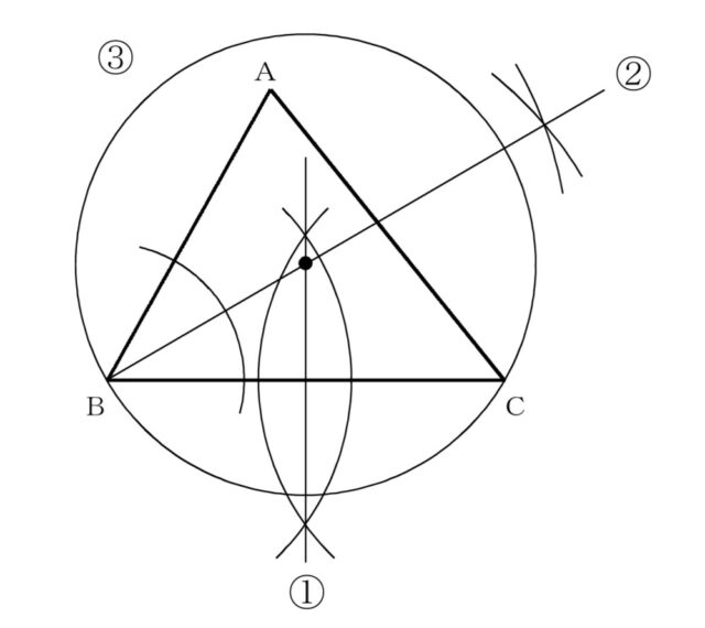 3.円をかく:「角の二等分線」と「垂直二等分線」が交わったところに針を置き、点B(または点C)に鉛筆を合わせて円をかきます。