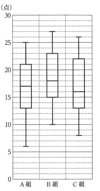 ・C組: 13点から22点まで(長さ 9) したがって、四分位範囲が最も大きいのは C組 です。