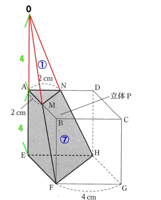 立体Pの体積比は⑦なので、三角錐O-AMNの体積を7倍します。
