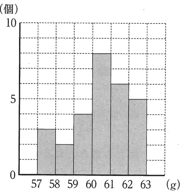 1-10:右の図は、28個の卵について、1個ずつ重さをはかり、その結果をヒストグラムに表したものである。例えば、重さが57g以上58g未満の卵は3個あったことがわかる。このとき、右の図のヒストグラムについて、最頻値を求めなさい。