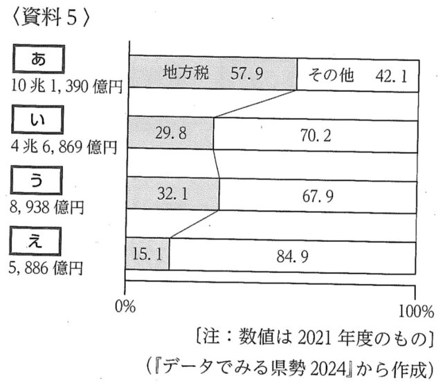 5-4:D班の学習課題について、資料5は、東京都、三重県、大阪府、島根県における歳入と、歳入に占める地方税の割合を示したものである。資料5の「う」にあてはまる都府県はどれか、次のア~エから最も適当なものを1つ選び、その記号を書きなさい。