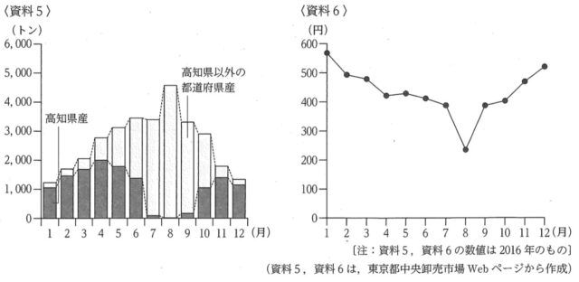 2-4:略地図に示した高知県について、資料5は、東京都中央卸売市場への、高知県産のなすの月別出荷量と高知県以外の都道府県産のなすの月別出荷量を示したものである。また、資料6は、東京都中央卸売市場における、なすの1kgあたりの月別平均価格を示したものである。高知県産のなすの月別出荷量には、どのような特徴があるか、資料5、資料6から読み取り、高知県以外の都道府県産のなすの月別出荷量と、なすの1kgあたりの月別平均価格にふれて、書きなさい。