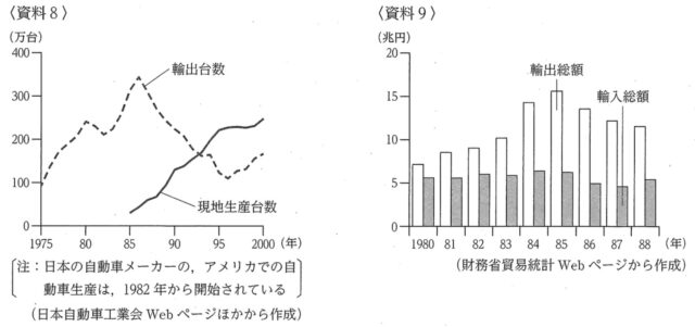 2-6:資料8は、1975年から2000年における、日本の自動車メーカーの、日本からアメリカへの自動車の輸出台数とアメリカでの自動車の現地生産台数の推移を示したもの、資料9は、1980年から1988年における、日本のアメリカへの輸出総額と日本のアメリカからの輸入総額の推移を示したものである。また、資料10は、かつやさんとまなみさんが、資料8、資料9をもとに話し合った内容の一部である。資料10の あ にあてはまる内容は何か、資料9から読み取り、書きなさい。