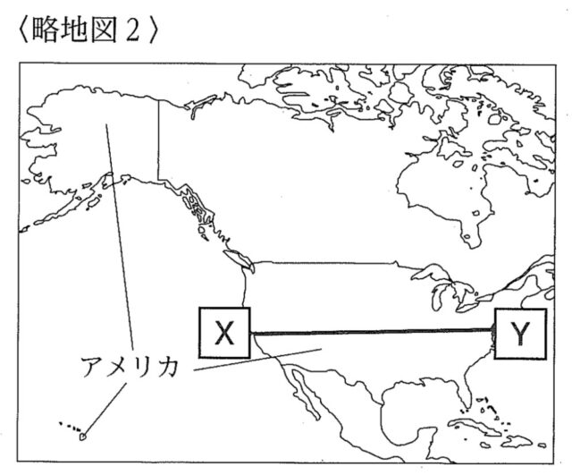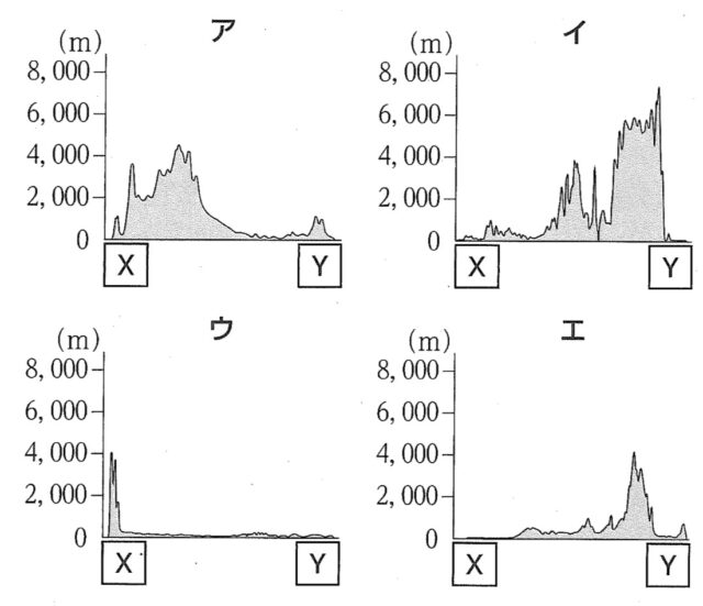 1-3a:略地図2に示したアメリカについて、次の(a)~(c)の各問いに答えなさい。 (a) 略地図2に示した X – Y 間の断面図はどれか、次のア~エから最も適当なものを1つ選び、その記号を書きなさい。