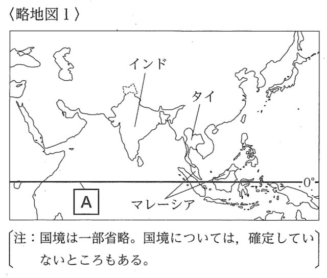 1-2a:略地図1に A で示した、緯度0度の緯線を何というか、その名称を漢字で書きなさい。
