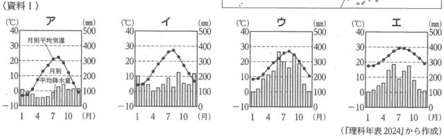 解説 : 略地図の b は高知県の高知市付近を指しており、ここは太平洋に面した太平洋側の気候に属しています。太平洋側の気候は、夏に季節風の影響で雨が非常に多くなるのが特徴で、資料1のグラフの中で夏の降水量が突出して多いのはウだけです。