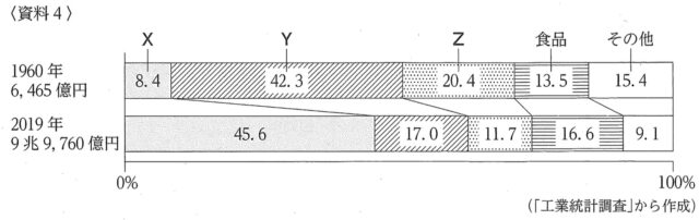 2-3:資料4は、略地図に示した福岡県の、1960年と2019年における、工業別の製造品出荷額の割合を示したものであり、資料4の X~Z は、化学、金属、機械のいずれかである。資料4の X と Y にあてはまる工業の組み合わせはどれか、下のア~カから最も適当なものを1つ選び、その記号を書きなさい。