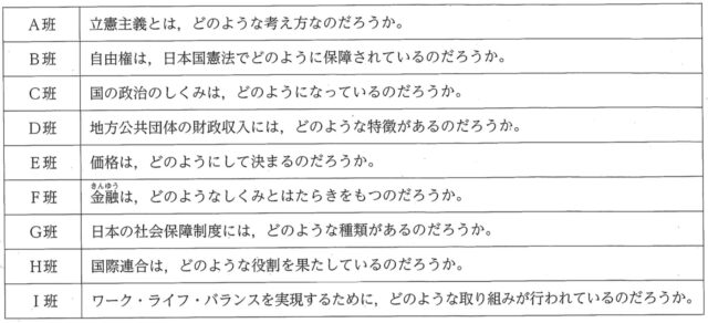 5 次の表は、こうじさんのクラスで行った公民的分野の学習において、班ごとに設定した学習課題をまとめたものである。これを見て、あとの各問いに答えなさい。