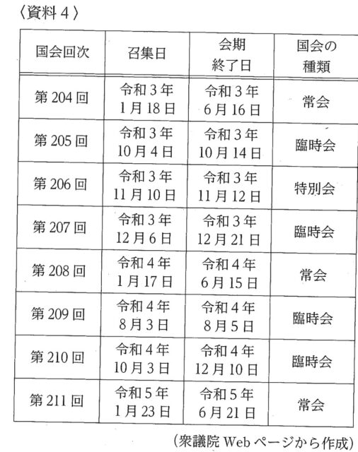 解説 : 資料4の第206回国会に注目すると、「特別会」が召集されています。特別会は、衆議院の解散にともなう総選挙のあと、30日以内に召集される国会のことです。