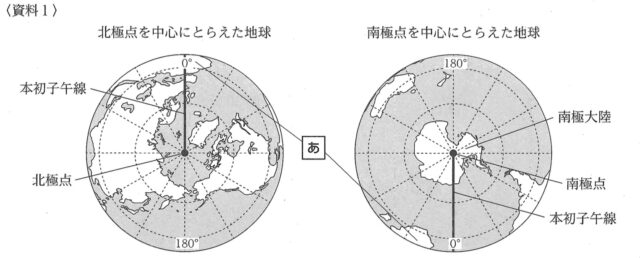 1-1:資料1は、北極点を中心にとらえた地球と南極点を中心にとらえた地球を示したものである。資料1の あ で示した大陸の名称は何か、下のア~エから最も適当なものを1つ選び、その記号を書きなさい。
