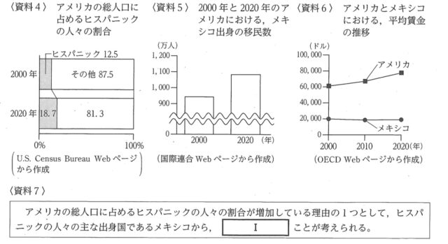 1-3c:資料4は、2000年と2020年における、アメリカの総人口に占めるヒスパニックの人々の割合を示したものである。また、資料5は、メキシコの1人あたりの国民総所得(GNI)とメキシコからアメリカへの送金額の推移を示したものであり、資料6は、2020年におけるメキシコの年齢別人口構成を示したものである。資料7の [ I ] にあてはまる内容は何か、資料5、資料6から読み取れることをもとにして、書きなさい。