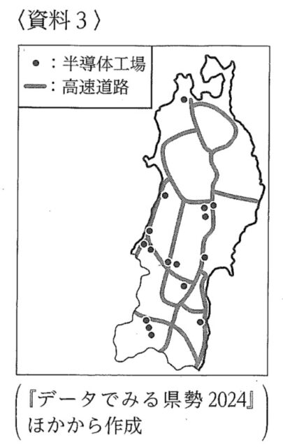 2-2b:資料3は、東北地方における半導体工場の分布と高速道路網を示したものである。東北地方で半導体工業が発達している理由について、資料3から読み取れる特徴を、「高速道路」という言葉を用いて書きなさい。