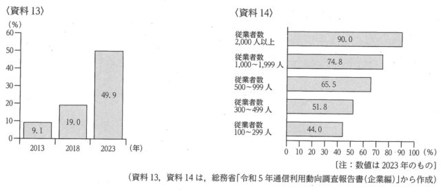 5-9:Ⅰ班の学習課題について、のぶこさんは、ワーク・ライフ・バランスを実現するための働き方の1つとして、厚生労働省が推進しているテレワークに興味をもち、資料を集めた。資料12は、テレワークについてまとめたものの一部、資料13は、日本における、テレワークを導入している企業の割合の推移を示したもの、資料14は、日本における、テレワークを導入している企業の割合を、従業者規模別に示したものである。日本の企業におけるテレワークの導入状況には、どのような特徴があるか、資料13、資料14から読み取り、書きなさい。