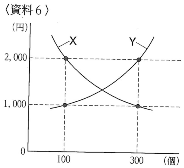 解説 : 資料6において、価格が上がると量が減る「曲線X」が需要量、価格が上がると量が増える「曲線Y」が供給量を示しています。