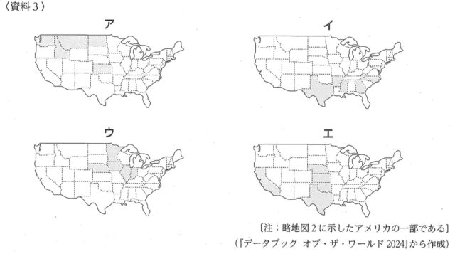1-3b:資料3のア~エは、小麦、とうもろこし、綿花、牛肉のいずれかの生産量が多い5つの州を ● で、それぞれ示したものである。小麦の生産量が多い5つの州を示したものはどれか、資料3のア~エから最も適当なものを1つ選び、その記号を書きなさい。