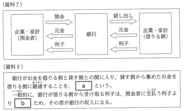 解説 : ・ (a): 資料7の図のように、預金者と借り手の間に銀行などの金融機関が入り、資金を仲介する仕組みを間接金融といいます。企業が株式などを発行して投資家から直接資金を調達する「直接金融」とは区別されます。