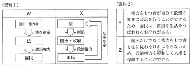 解説 : ・「法の支配」の模式図(資料1-X): 「人の支配(W)」では権力者が法を作って国民を支配しますが、「法の支配(X)」では法が国王や政府を制限し、そのルールに基づいて政治権力が使われる仕組みになっています。