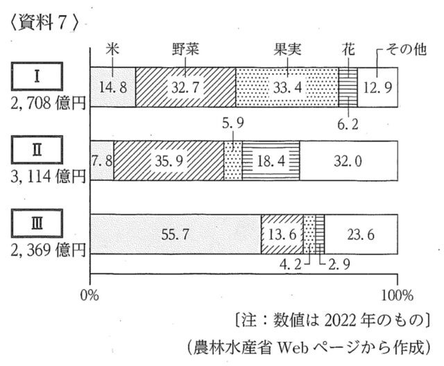 解説 : 新潟県:新潟県は日本を代表する稲作地帯であるため、資料7の中で「米」の割合が55.7%と圧倒的に高い III が新潟県に該当します。