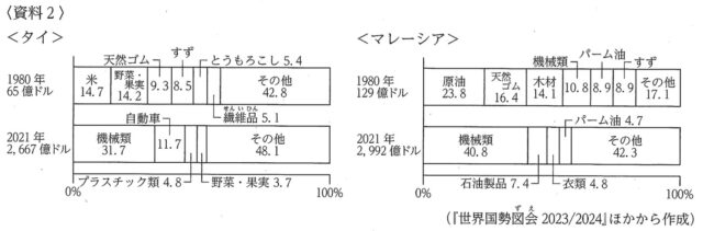 1-2c:資料2は、略地図1に示したタイとマレーシアにおける、1980年と2021年の、輸出総額と輸出品目別割合を示したものである。資料2から読み取れることとして、誤っているものはどれか、下のア~エから1つ選び、その記号を書きなさい。