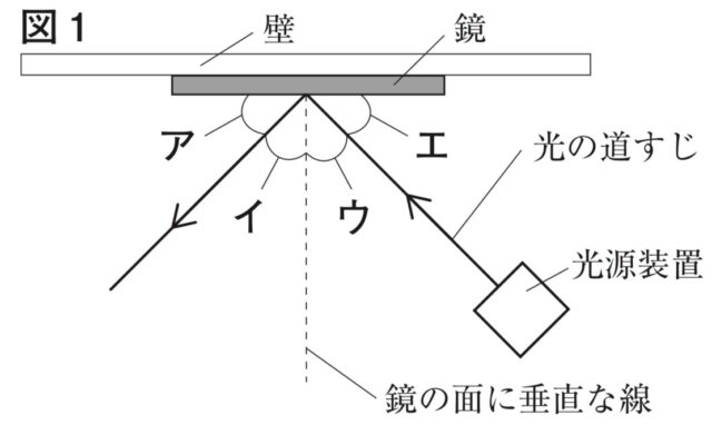この入射光と、鏡の面に垂直な線(点線)との間の角は、ウ で示されています。