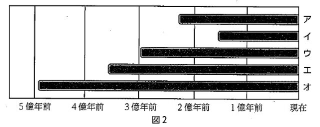 7-1:下線部①について、図2は鳥類、魚類、両生類、ハチュウ類、ホニュウ類の出現する年代をまとめている。図2の中でホニュウ類をあらわすものとして、最も適当なものをア~オの中から1つ選び、記号で答えなさい。