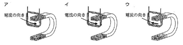 コイルに流れる電流の向きやU字型磁石のN極とS極の位置を変えて、同様の実験を行った。このとき、コイルが動く向きが図6と同じになるものとして、最も適当なものを次のア~ウの中から1つ選び、記号で答えなさい。
