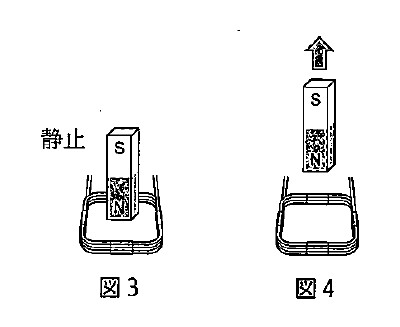 図4のように上向きに動かすのは、〈実験1〉の図2と反対の動きである。このとき検流計の針は右側にふれたので、図4のように動かしたときは検流計の針は左側にふれるとわかる。