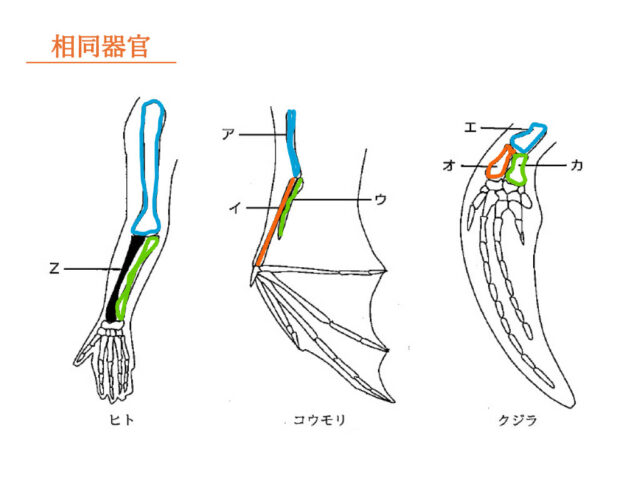 解説 : ヒトの骨と、コウモリとクジラを比較した場合、以下の図のように整理できる。