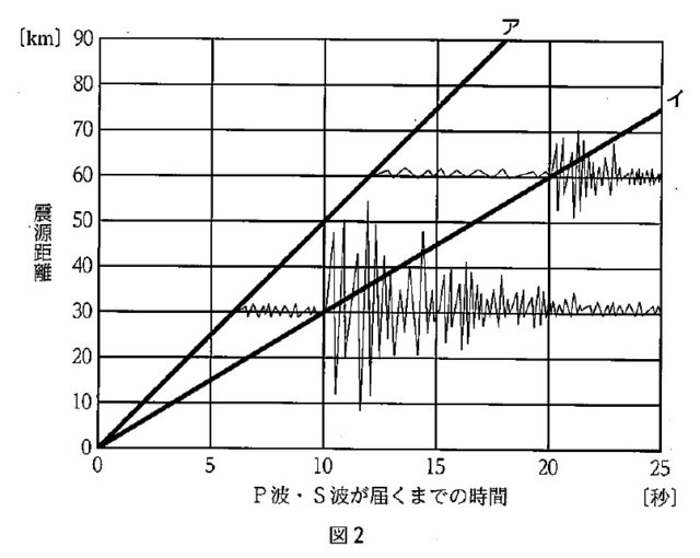 1-2:図2の直線のグラフはある地震について、P波・S波が届くまでの時間と震源距離の関係を表している。また、波形は地震計の記録を表している。地震発生から主要動が始まるまでの時間と震源距離の関係を表すグラフとして、最も適当なものを図2のアまたはイから1つ選び、記号で答えなさい。