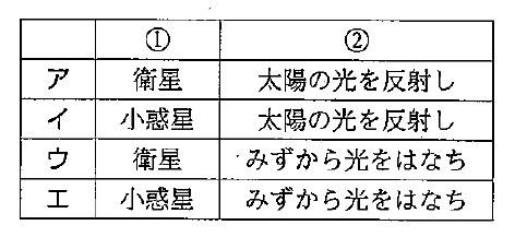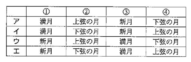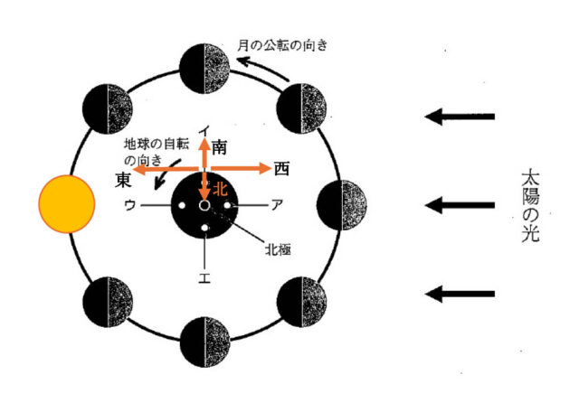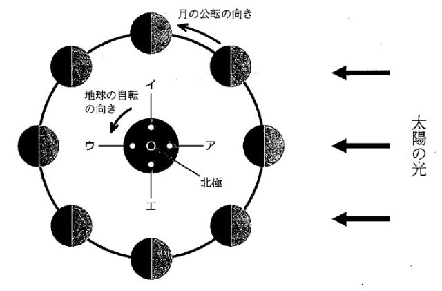 解説 : 地球で満月が見えるのは、選択肢ウの方向である。選択肢ウの方向が東になるような位置は、選択肢イの位置に立ったときである。