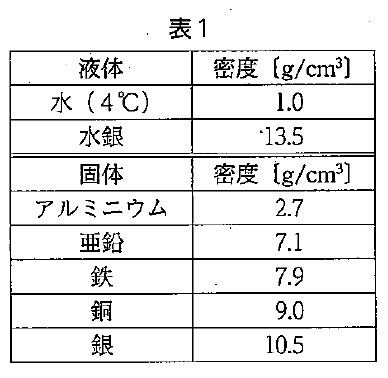 物質の密度に関する実験を行った。表1はいろいろな物質の密度を示している。次の問いに答えなさい。