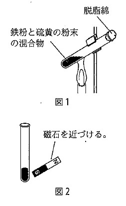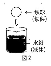2-3:鉄球(鉄製)を水銀(液体)に入れたとき(図2)、鉄球がうくかしずむかを確認する操作を行い、その結果をまとめた。次の文の空欄( ① )、( ② )に当てはまる最も適当な語句を答えなさい。
