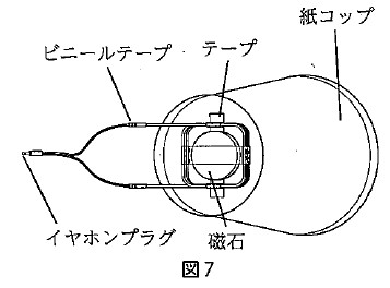 図7のようにコイルの先端をイヤホンプラグに接続し、接続部をビニールテープで巻いた。その後、コイルを紙コップの底面に、磁石をコイルの内側に、それぞれテープではりつけた。イヤホンプラグをタブレットのイヤホンジャックにさしてタブレットで音楽を再生すると、紙コップから音が聞こえた。
