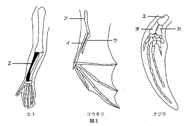 7-3:下線部③について、図3はさまざまなホニュウ類の骨格を比較したものである。ヒトの骨Zは、コウモリとクジラではどれに相当するか。最も適当なものを、図3のア~カの中からそれぞれ1つずつ選び、記号で答えなさい。