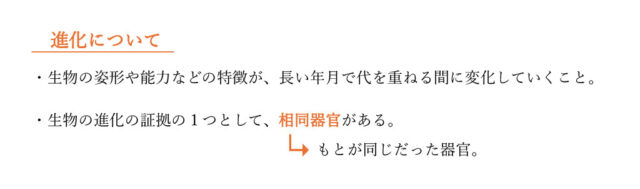 解説 : 進化とは、生物のからだの特徴が、長い年月で代を重ねる間に変化していくことである。