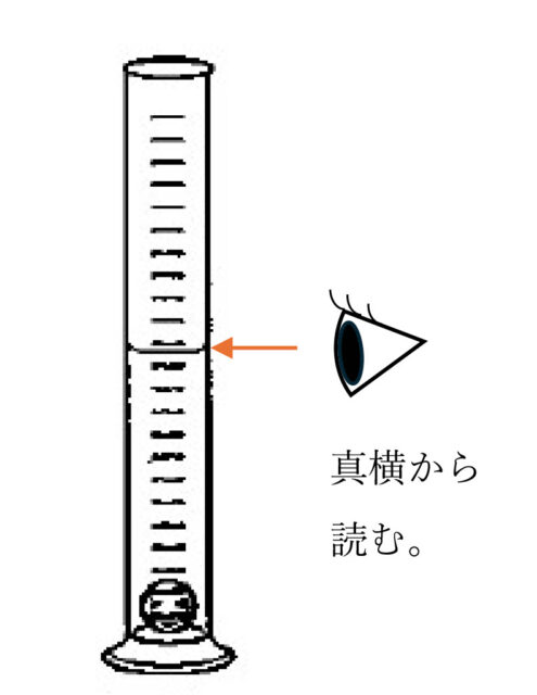 解説 : メスシリンダーの使い方は、水平なところに置き、目の高さを液面と同じにして真横から水平に見るようにする。また、液面のへこんだ面を見る。