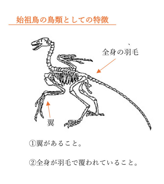 ①翼があること、②全身が羽毛で覆われていることの2つが、始祖鳥の鳥類としての特徴である。よって、翼を持つことが、前あしの特徴である。