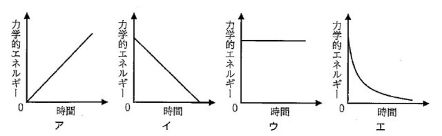 解説 : 力学的エネルギーとは、位置エネルギーと運動エネルギーとの和である。また、力学的エネルギー保存の法則により、外部から力を受けない限り力学的エネルギーは一定であると考えられる。よって、選択肢ウのグラフが適当である。
