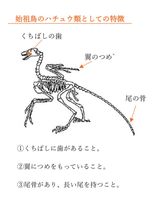 ハチュウ類との特徴は、①くちばしに歯があること、②翼につめをもっていること、③尾骨があり、長い尾を持つこと3つである。このうち前あしの特徴はつめがあることである。