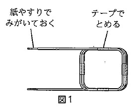 図1のようにエナメル線を巻き、巻いた部分がほどけないようテープでとめる。エナメル線の端は、紙やすりでみがいて導線を出しておく。