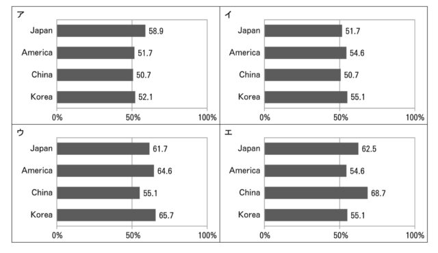 解説 : 本文の Graph 2 の説明に「4カ国すべてで50%から60%の間」であり、「日本はアメリカと韓国よりも割合が低かった」とあります。これに該当するのは、Japan (51.7) が America (54.6) と Korea (55.1) より低く、全数値が50-60の間である「Graph イ」だけです。