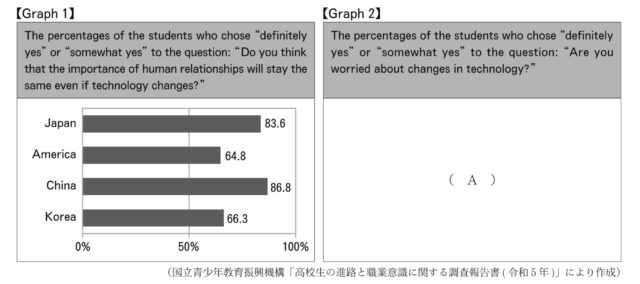 グラフ1は、「技術が変化しても、人間関係の重要性は変わらないと思いますか?」という質問の結果を示しています。この質問に対しては、4カ国すべてにおいて [ ① ] が「絶対にそう思う」または「ややそう思う」を選びました。4カ国のうち、その質問に「絶対にそう思う」または「ややそう思う」を選んだ生徒の割合は、[ ② ] が最も高かったです。グラフ2は、「技術の変化について心配していますか?」という質問の結果を示しています。その質問に「絶対にそう思う」または「ややそう思う」を選んだ生徒の割合は、4カ国すべてにおいて50パーセントから60パーセントの間でした。そして、日本においてそれら2つの回答を選んだ生徒の割合は、アメリカと韓国におけるその割合よりも低かったです。