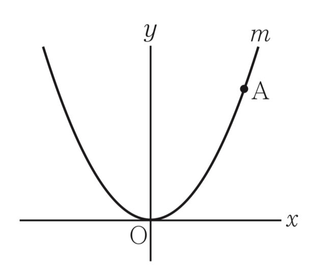 2-9:右の図において, mは関数 y=ax^2 (aは定数)のグラフを表す. Aはm上の点であり, その座標は (5,7) である. aの値を求めなさい.