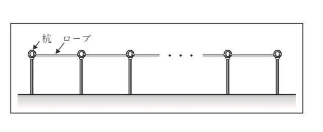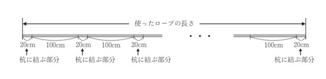体育祭の準備のため, Fさんはグラウンドで先生と一緒に, 杭を打ってロープを張ることになった. ロープは, それぞれの杭の上部にある輪に結びながら張っていく. 杭に結ぶ部分のロープの長さはすべて20cmであり, ロープはたるみなく張るものとする.