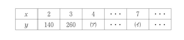 解説 : 先に式を求める. xとyの関係が1次関数 y=ax+b で表されると仮定し, xが1増えるごとにyが120ずつ増える. よってa=120, y=120x+b となる. x=2 のとき y=140 より, 140=120×2+b, 140=240+b, b=−100 となる. したがって, y=120x−100